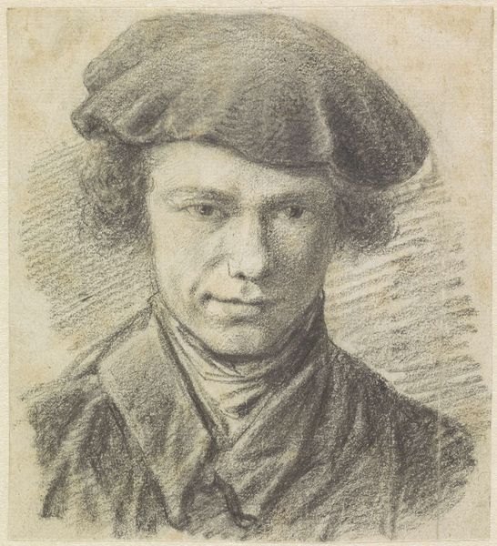 Curator: Let's take a moment to examine "Zelfportret" by Barend Cornelis Koekkoek. The Rijksmuseum tells us this self-portrait, dating roughly from 1813 to 1862, is rendered in pencil. Editor: There's a compelling rawness here. The quick pencil strokes seem very immediate. It feels less like a finished piece and more like a study of the artist’s own face. Curator: Absolutely, and that immediacy highlights the artist's hand – the material reality of the art-making process. Koekkoek, celebrated for his landscapes, seemingly used readily available, inexpensive materials. Pencil, paper, the artist himself - all at hand, collapsing the distance between artist and subject, labor and image. Editor: Indeed, the image speaks to a self-awareness developing amongst artists. It’s interesting to consider this piece within the broader social and institutional context of the time. Self-portraits are statements. They declare an individual's place in the world. Curator: And the hat? Such a casual but significant detail. We get a sense of the individual, not simply a generalized, idealized portrait. The lines around the eye are telling in their use. It’s not about smoothing over reality, but embracing the physicality of the subject. Editor: Right, think about how the accessibility of pencil and paper impacted the kind of art that was being produced and disseminated! It democratizes art, bringing the potential for representation and self-fashioning to a broader populace beyond the patronage networks. It's powerful. Curator: Exactly. He explores the interplay between artist, materials, and the final representation. This connects it with the consumption habits of the era, questioning the nature and cost of image creation. Editor: It makes you wonder about the networks that sustained Koekkoek's career – his patrons, dealers, and fellow artists who saw and reacted to these works. Even a 'simple' self-portrait carries the weight of a complex social matrix. Curator: This quick study becomes surprisingly rich in terms of materiality and context. Editor: Yes, something as humble as a pencil drawing can offer a surprisingly sophisticated portrait of an era.