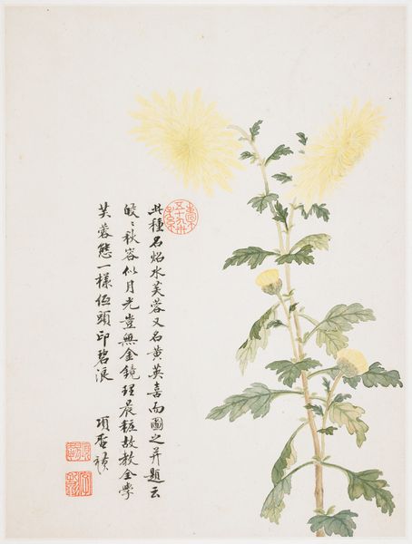Xiang Shengmo created this painting titled, "Day-Lily from a Flower Album of Ten Leaves," using ink and color on paper. The delicacy of the flower is rendered with fine lines and washes of color, contrasting sharply with the bolder, more abstract rendering of the rock at the base. The flower, positioned towards the upper right, draws our eye with its warm colors and intricate detail. Notice how Shengmo has left much of the paper untouched, creating a sense of openness and inviting contemplation. The calligraphy provides a textual layer that complements the visual elements. The placement of these inscriptions doesn't just fill the empty space, but directs our gaze. Shengmo destabilizes the traditional approach to representation by combining naturalistic elements with abstraction and textual commentary. He asks us to question the relationship between what we see, what we read, and what we understand. Consider how the balance between the detailed flower, the abstract rock, and the calligraphic text, creates a dynamic interplay of form and meaning, reflecting a sophisticated understanding of semiotics and representation.
