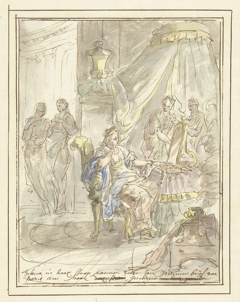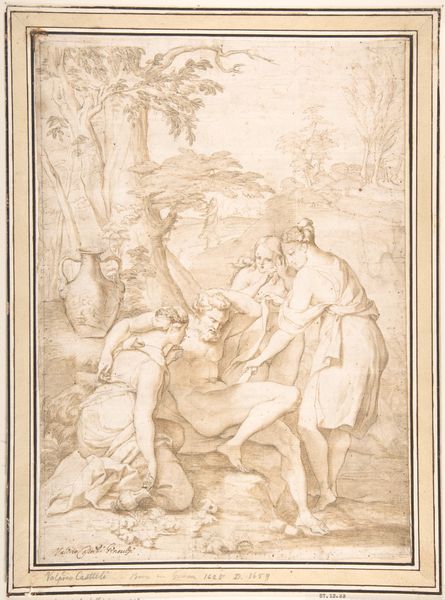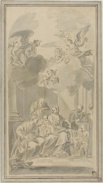 Giovanni Maria Morandi created this drawing of Pope Clemens XI, surrounded by adoring figures, using brown ink and wash. The monochromatic palette allows us to focus on the interplay of light and shadow, defining the figures and architectural setting. The composition is structured to emphasize the Pope’s central, elevated position, reinforcing a hierarchy through spatial arrangement. Consider the semiotic implications of this formal structure. The use of linear perspective draws our eye towards the pontiff, effectively centering papal authority. The supplicants below perform their roles in a highly structured, almost theatrical display of reverence. The contrast between the detailed rendering of the Pope and the more generalized treatment of the crowd subtly communicates power dynamics. Note how Morandi uses the formal elements of drawing—line, tone, composition—to articulate a complex social and religious order. This piece not only reflects its time but invites us to consider how such visual strategies function to create and maintain systems of meaning. Art is always more than meets the eye; it is a discourse made visible.