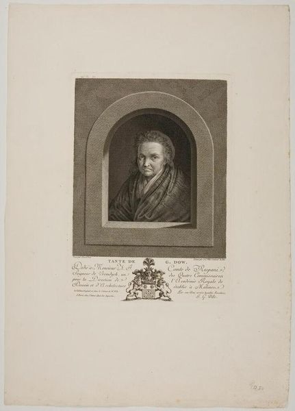 Editor: Here we have a portrait of Henriette Marie Anne de Fumel, etched by Pierre François Bertonnier. It has a rather somber and contemplative feel, wouldn’t you say? How do you interpret this work? Curator: It’s interesting how Bertonnier captures her serenity, isn't it? The etching technique gives a soft, almost dreamlike quality to her features, yet there's also a stark realism. It makes you wonder what stories those eyes hold. Do you see a hint of melancholy, perhaps? Editor: Now that you mention it, yes. The lighting emphasizes the lines on her face, hinting at a life fully lived. Curator: Exactly! And to me, that's where the real beauty lies—in the acceptance and quiet strength reflected in her gaze. Art isn’t just about what we see, but how it makes us feel and reflect.