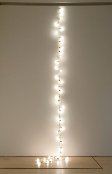 This light sculpture, "Untitled" (Last Light), is by Felix Gonzalez-Torres. What is striking is how a string of lights, something so simple, can evoke so much feeling. The making here isn't about a grand gesture, but a quiet, deliberate act of arranging and presenting. Look at the way the lights hang. Each bulb emits a soft, warm glow, casting the surrounding space in a gentle light. The texture is created by the contrast between the cool, smooth bulbs and the simple wire. It is a kind of drawing with light and shadow that feels both fragile and resilient. Notice how the lights don't shine with the same intensity – some are brighter, some dimmer, suggesting the passage of time and the inevitable fading of light. Gonzalez-Torres shares a kinship with artists like Agnes Martin, who used simple forms and repetition to create deeply meditative works. Like Martin, Gonzalez-Torres invites us to slow down, to contemplate, and to find meaning in the everyday. He reminds us that art can be found in the most unexpected places.