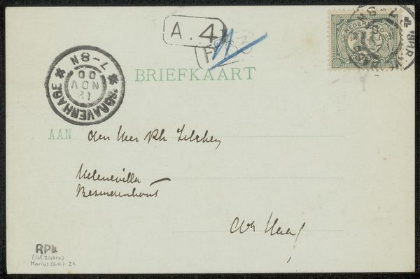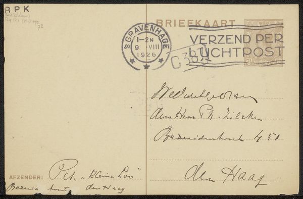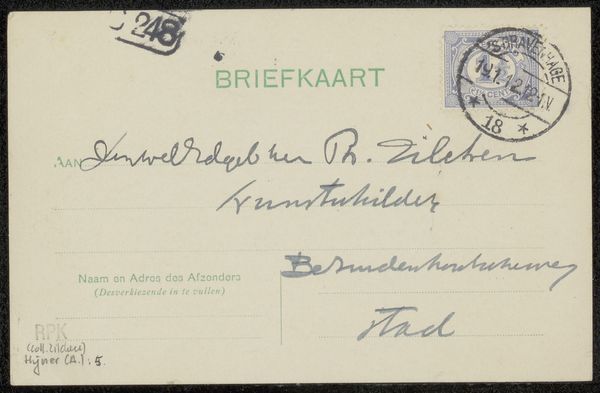 Curator: We're looking at a vintage postcard, entitled "Briefkaart aan Max Dittmar Henkel," believed to be from around 1925, crafted by Jacobus Henricus Maria Hagen. The materials used are paper and ink, showcasing a beautiful sample of calligraphy. Editor: Immediately, I'm struck by the elegance of the cursive script against the stark simplicity of the card. There's a pleasing rhythm to the descending loops and the evenness of the line weight. Curator: Indeed, Hagen's skill is evident, but let's consider the historical context. Max Dittmar Henkel was a conservator at the Rijksmuseum’s print cabinet in Amsterdam, and this postcard offers us a glimpse into the professional circles of the Dutch art world during that period. We see the formal address: "Den Weled Heer", literally "The Esteemed Mr.". Editor: Absolutely, the careful penmanship certainly speaks to a certain level of formality and respect between colleagues. But, considering the design, what about the stamp and the printed aspects? Curator: The “Briefkaart” heading indicates a standardised format dictated by postal regulations. The placement of the Vaassen postal stamp and the sender’s details suggest a system geared towards efficient communication. These details situate Hagen's artwork within the postal system. The stamp tells us something too. The location suggests that the sender may have lived there, or the place the mail passed through. Editor: Agreed. What I find intriguing is the interplay between the mechanised aspects of printing and the handmade nature of the handwriting. This friction adds layers, transforming a simple piece of correspondence into a historical document. The contrast in type hints to its industrial mode. Curator: Exactly! The postcard isn’t just a message; it’s an artefact embodying social practices and communication norms of its time. It subtly alludes to Hagen’s societal and artistic place within Amsterdam's art scene. Editor: Looking closer, there is also a certain incompleteness; on the front where an image might be present, instead there’s the trace of a redacted or censored aspect on the other panel with “4 365”, that prompts curiosity. Curator: That's a thought-provoking observation. Considering it was post-World War 1 and the rise of new socio-political factors influencing art, these number sequences may also hold important implications, particularly considering Hagen was writing to a Rijksmuseum worker. It all becomes interconnected! Editor: So, it transforms a momentary glimpse into this small world where Hagen created work during this period in Dutch society. Curator: Precisely! Editor: Hagen offers much to delve into.