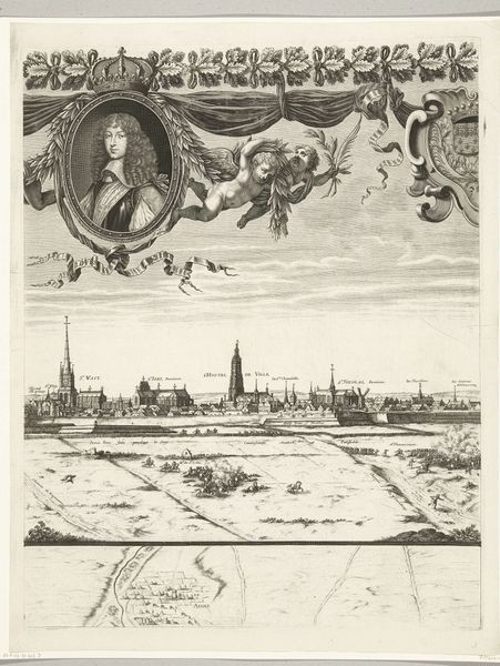 Nicolas Cochin engraved this image in 1654, titled "Relief of Arras, besieged by the Spanish." High above the city we see a crowned coat of arms, symbols of authority and dynastic power, floating ethereally between garlands and a cherubic figure. This emblem of authority, this heraldic shield, is no mere static symbol. It echoes through history, doesn’t it? I'm reminded of the shields of antiquity, the Roman eagles, the medieval banners—each a condensation point for collective identity and power. Here, it signifies the might of the French monarchy, a reassurance to the besieged citizens. But consider the cherub, too. Traditionally, these figures symbolize divine intervention, hope, and renewal. How often do we see them heralding victory or salvation across epochs? From classical winged figures to Renaissance putti, they embody humanity's eternal desire for deliverance. Perhaps such deep-seated cultural memory explains the enduring emotional resonance of these motifs, engaging us at a subconscious level with themes of power, hope, and salvation. Their appearance, in essence, is a cyclical return—a persistent echo in the theater of history.