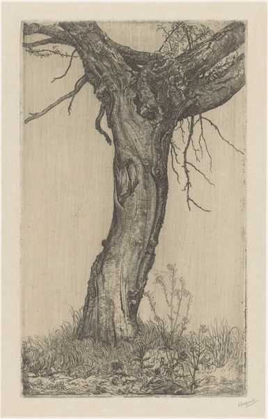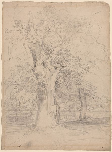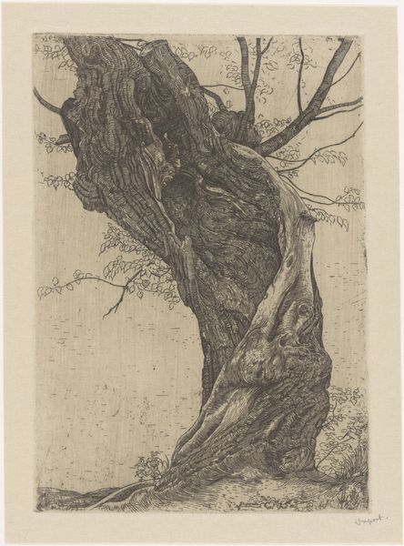 Curator: This drawing, rendered in pencil and ink, is titled “Boomstudie, te Vogelenzang.” The artist is Simon Moulijn, and the date assigned to it is 1925 to 1926. Editor: Striking. The tree seems to struggle, reaching out with arthritic limbs. I find it simultaneously unsettling and deeply familiar. It makes me think about endurance, but also precarity. Curator: It's fascinating to consider that Moulijn likely created this en plein air. What materials would he have carried? What considerations did he have to take into account? One envisions Moulijn carefully selecting his paper, pencils, and inks for their portability and archival qualities. What was available to an artist in that period, and where might Moulijn have procured it? The drawing embodies the physicality of landscape, reflecting Moulijn’s own labor and embodied experience. Editor: And Vogelenzang itself... that location shaped Moulijn's subject. Think about its socio-economic conditions during the interwar years. It becomes less about idealized nature and more about understanding how humans shaped the environment around them. Consider this work alongside others from that period depicting nature in industry or agricultural scenes. Was it common to see depictions of aging, struggling trees? What might it have said about Vogelenzang, the people living there, and the Dutch Republic in general during those difficult interwar years? Curator: True. By choosing this gnarled tree as a subject, Moulijn invites us to contemplate themes beyond picturesque beauty, pointing perhaps towards an embrace of imperfect materials and natural forms. The tree almost serves as a kind of found object. But, it is transformed by Moulijn’s hand through close observation and mark making. Editor: Right, the marks translate an observed reality into a commentary. The choice to capture *this* particular subject in this specific way invites conversation about societal shifts, environmental changes, and the public perception and function of art at that moment in history. What political leanings might an artist capturing an "unpretty" tree represent at the time? Was this work viewed differently in public than if it was kept in private hands? Curator: It’s thought-provoking to connect a simple drawing to larger cultural shifts and anxieties around labor and industry. It shifts my perspective entirely. Editor: Mine too! I leave with an invitation to see all art through a socio-political lens, ever mindful of whose story is and isn't being told.
