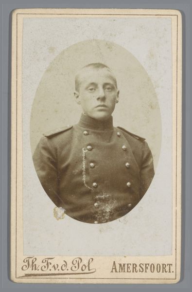 Curator: This is a portrait of a young man in uniform, a gelatin-silver print attributed to Jan Goedeljee, created sometime between 1880 and 1905. Editor: It’s immediately striking—the rigid formality of the pose, offset by the softness of the sepia tones. The textures in his uniform and the subtle play of light across his face create an interesting dynamic. Curator: Exactly. This photograph comes from a period of increasing militarization across Europe. Studio portraiture like this served a dual purpose: personal remembrance, and a powerful visual reinforcement of military ideals within society. Imagine the social expectations placed on this young man! Editor: You see social expectations, and I see a study in geometric forms. The rigid lines of his uniform juxtapose against the oval shape framing his face, directing the eye. Consider how the light catches on the buttons and the delicate fringe—those compositional choices elevate this above a simple document. Curator: But to call it "simple" disregards the historical context. Photography became accessible, allowing wider societal representation. What stories are embedded here of duty, nationalism, and perhaps even social mobility linked to military service? How many others like him commissioned similar portraits, furthering the military's reach in daily life? Editor: Fair enough, but look at how the photographer manipulates the medium itself. The tonal gradations aren’t accidental; there's a careful consideration to the balance between detail and abstraction, making the figure almost float in the picture plane. The materiality adds another layer. Curator: That's also Goedeljee catering to expectations of his clientele. How the image itself is used—passed down in families, displayed in public—dictates its success and helps circulate cultural values about masculinity and nationhood. Editor: So while I get lost in the details of form and texture, you are drawn to societal narratives reflected within this young man's representation. Curator: It's more like seeing this single image as an opening to countless stories and to its position as a signifier of an age. Editor: Which perhaps underscores art's ability to function on many levels—as a aesthetic object, a document of a life, and a vehicle for historical understanding.