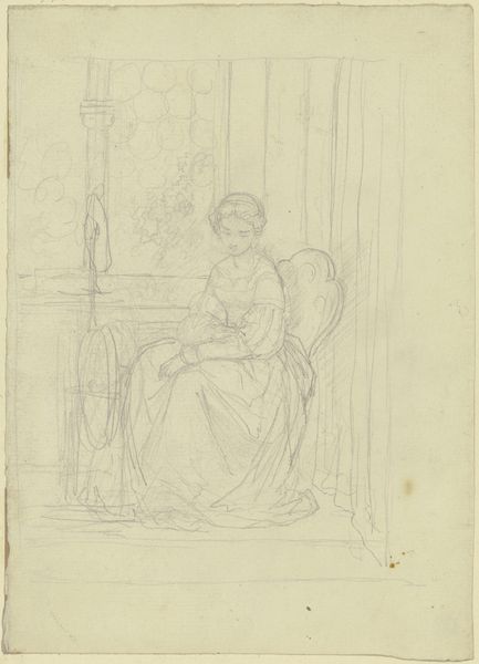 Curator: Welcome. Before us, we see Nicolai Abildgaard's drawing from the early 19th century, dating between 1803 and 1809. It’s titled "Profilbillede af kunstnerens anden hustru Juliane Marie Abildgaard, siddende, hel figur," which translates to "Profile portrait of the artist's second wife Juliane Marie Abildgaard, sitting, full figure.” Editor: My first impression is one of calm reserve, almost stoicism. The restrained use of line and the pale tonality create a sense of quiet dignity. Curator: Indeed. Abildgaard employs a masterful, academic approach to realism. Observe the delicate hatching, used with great economy. The structural elements—the precise rendering of her dress, the chair—reveal his meticulous attention to form and composition. Editor: And the pose… hands clasped demurely in her lap, averted gaze. It's fascinating how a posture can convey so much about the subject's societal position. It echoes conventions for portraying women from this period; there’s a sense of restraint, hinting perhaps, at the limitations placed upon women. Curator: Agreed. Symbolically, her seated pose reinforces stability and permanence, ideas further expressed by her firm, clasped hands, denoting domesticity and submission. The bareness of the background emphasises this further, creating a void which centers only on the wife. Editor: The plainness also invites us to concentrate on Juliane herself. Consider the symbolism of clothing too, specifically of the headscarf wrapped above her hair. The scarf, although plain, acts as both a framing structure around her face, but also obscures her features from display. Her hidden face presents the iconographic value of 19th century ideals, whereby women did not fully embody free expression in the way that males were given. Curator: Certainly. One can discern a dialectical play between external expectation and interiority – between objective realism and an expression of her individual status. Even this sketch tells us as much. Editor: What an interesting confluence of form, materiality and symbolic nuance. Curator: Precisely; a quiet portrait of structural brilliance!