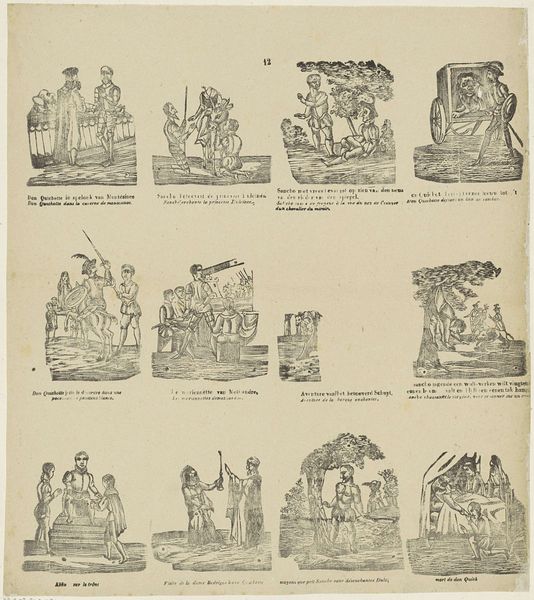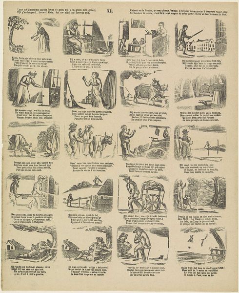 This print titled "Onderscheydene militaire afbeeldsels / Différentes scènes militaires", or "Various Military Images" in English, was made by Glenisson & Van Genechten. The image presents a series of small vignettes depicting scenes from military life, each accompanied by text in both Dutch and French. These scenes offer a glimpse into the daily routines, interactions, and social dynamics within the military sphere of its time. Created in a period marked by significant political and military upheaval in Europe, one wonders if it reflects the social attitudes toward military service, leadership, and the common soldier. Perhaps this print served as a form of popular entertainment, celebrating military life and promoting national pride. To fully understand this print, we could consult military archives, period newspapers, and collections of popular imagery. This would allow us to gain greater insight into the print's function within the broader social and cultural landscape of its time.