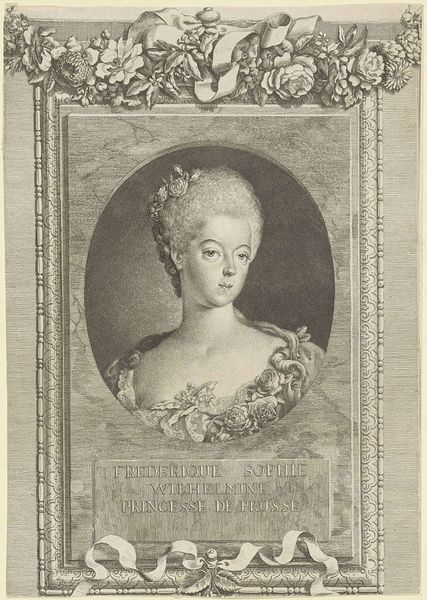Curator: What a fascinating study in composure and status. Pierre Chenu’s 1766 engraving offers us a glimpse into the image of Marie de' Medici, Queen of France. It's a Baroque portrait, isn't it? You can almost hear the rustle of silk. Editor: It strikes me as meticulously formal, yet oddly gentle. There's a sense of stillness, but I also find it incredibly precious... almost delicate despite the weighty implications of power associated with royal portraiture. Curator: Absolutely. Consider the social context: portraits of royals served as propaganda, designed to project authority and legitimacy. Engravings like this one made the image widely accessible, allowing for broader dissemination and reinforcement of Medici's image as Queen. Editor: It’s funny you mention "legitimacy" as that's a potent undercurrent throughout the entire artwork! Everything, from the elaborate ruff to the carefully structured hairstyle, speaks volumes about crafting a regal persona, even going back so far as after her regency ended. It all makes me wonder... was this how she wanted to be seen, or how she felt obligated to present herself? Curator: It’s a question of performativity. Her position demands a specific appearance, which, in turn, dictates a role she must embody for France, her subjects, and, more broadly, history itself. What a pressure to be a character as well as yourself, if one can make that differentiation when royal. Editor: Absolutely! What remains, though, is the humanity peering through the veil of royal obligation. Despite the rigid formality, I can imagine what may have really gone on with Medici and perhaps even feel for the woman beneath. It’s so beautifully… paradoxical. Curator: Perhaps that duality is precisely where its enduring appeal resides. It encapsulates her. And she becomes timeless in that way. Editor: Indeed. It allows us to peek beneath the gilded surface, reminding us that even in the most elevated positions, humanity endures, whether celebrated or condemned. It's deeply compelling.