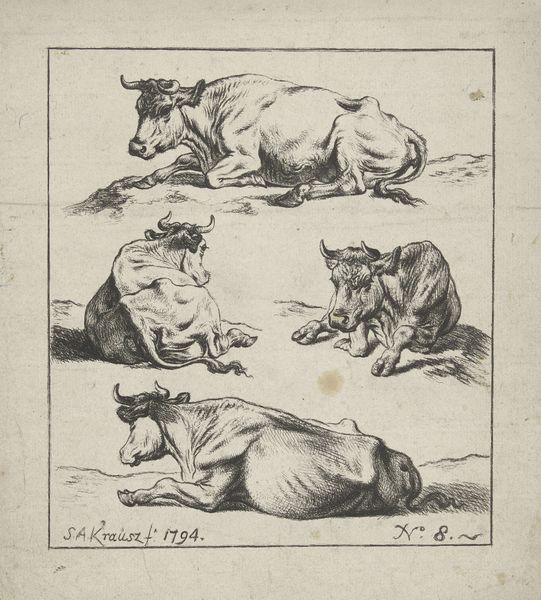 Editor: This is "Study of Standing and Grazing Cows," a graphite drawing made in 1794 by Simon Andreas Krausz. It feels almost scientific in its precision, like a catalog of bovine anatomy. What strikes you about this work? Curator: The date is key: 1794, just after the French Revolution, a period of massive upheaval questioning traditional power structures. Even a seemingly simple study of cows can be viewed through that lens. Consider the social and economic role of livestock. Who owned these cows? What did they represent? Editor: I hadn’t thought of that. So, instead of *just* cows, they’re symbols? Curator: Exactly! They might represent wealth, sustenance, and power – all things that were being radically redefined at the time. Krausz’s meticulous approach could be seen as an attempt to document a vanishing agrarian world, or perhaps, to assert a certain order amidst social chaos. Notice the different poses: standing, grazing… What stories do they tell about the lives of these animals, their relationship to labor, and to the people who depend on them? Editor: It's interesting how looking at the context can completely change how you see something. I was just appreciating the technique. Curator: The technique is undeniably important, but considering the historical and social forces at play adds a critical layer to our understanding. It makes us question the very act of representation and its implications. What does it mean to capture these specific cows in this specific way, at this specific moment in history? Editor: I see what you mean. I'll never look at farm animals the same way again. Curator: Good. Art shouldn’t exist in a vacuum. Thinking about the complex connections between art, history and society is crucial to unlock deeper meanings in this, and other works.
