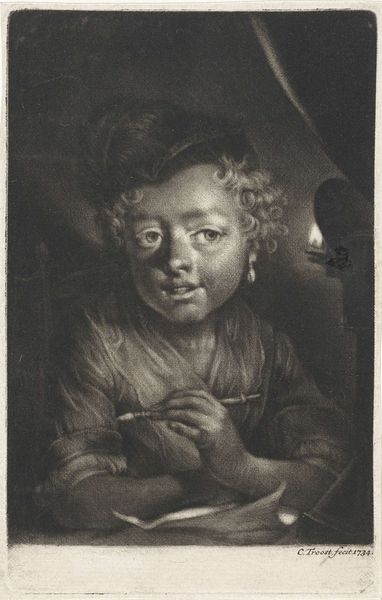Curator: I find this drawing so enchanting. The artist, Cornelis Troost, captured this girl, likely Johanna Troost, in 1734. Editor: Yes, there's something captivating about her gaze. The soft lighting lends a quiet, almost melancholic atmosphere. It's striking how much detail he gets with ink, charcoal and pencil on paper, mostly just outlines. Curator: Isn’t it? Especially considering it's a relatively small drawing. And think about her story: there she is, this girl, in that soft glow from the candle and a hat, so aware of being depicted. Was it staged or natural? Is she posed or in her place? The uncertainty pulls me into that moment, her moment of existence frozen in time. Editor: It’s compelling. Structurally, I am intrigued by how the Baroque conventions of portraiture are both observed and slightly subverted. The use of chiaroscuro to define her form places the emphasis not just on idealized beauty, but, equally, the drawing offers very tangible expressions of everyday humanity in it's construction of the composition and treatment of surface textures. Curator: Exactly. It transcends the era. We can tell Troost invested emotionally, rather than just focusing on superficial aspects. There's something deeply genuine about the piece, like catching a private thought, and at a domestic moment. Editor: The realism combined with the stylization makes it visually quite complex. And yet there's clarity. Curator: Yes, as the viewer, I become active, present. In that shared human experience with her... the humaneness of it really connects through time, I believe. Editor: The use of these monochromatic medium makes the drawing a highly charged vehicle for the intimate dialogue that can exists between artist, subject and us, the spectators. Curator: Absolutely. Seeing this little girl is such a reminder that art, at its best, it opens our minds and eyes beyond historical analysis and allows feelings. Editor: And to think that simple shades of pencil, charcoal, and ink can trigger such complex emotional responses!