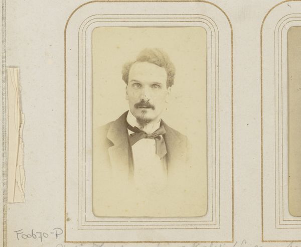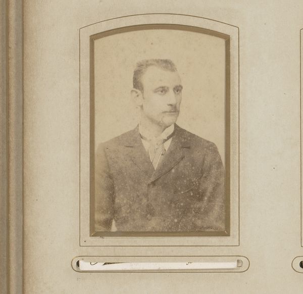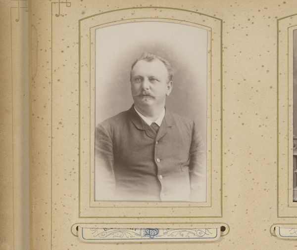 Curator: I'm immediately drawn to the materiality of this object. We're looking at what appears to be a gelatin-silver print, presented in a bound format. "Portret van een man met snor," or "Portrait of a Man with a Moustache," dating from around 1860 to 1900, offers an interesting insight into photographic portraiture during this period. Editor: It certainly has a somber quality, doesn’t it? The tones are muted, lending the image a gravitas, and it’s not just the tones. He looks serious, almost stern, in his pose. It feels very posed and formal. I wonder what his story is. Curator: I agree. Think of the labour involved: creating the photographic chemicals, meticulously posing the sitter, printing and then painstakingly mounting this gelatin print within what is a beautifully crafted album page. It speaks to the value placed upon image making in representing status during this period. How were the sitter’s labor, class, or industry reflected, and consumed by society, after its making? Editor: Absolutely. Photography democratized portraiture, but also formalized it in its own way. Before, portraiture was largely confined to the elite. What strikes me is that these portraits often became displays of social standing and respectability. He is looking to his left, is wearing a respectable jacket with white dress shirt, all neatly presented. Curator: Precisely, this process, involving chemistry and printing, offered new possibilities. You can also look at the binding, too. Someone laboured to craft this as an album. The presentation reinforces how carefully constructed even relatively ‘common’ images could be in this time, from photographic process through to dissemination as valued item or display of social standing within familial settings. Editor: This era saw a flourishing market in these kinds of photographs and albums. Studios popped up everywhere catering to this new desire for personal mementos. We now understand, viewing at a remove of nearly two centuries, the construction of identity inherent within these displays. What was valued, deemed important, worthy of remembrance is reflected both in its composition and its creation. Curator: Right, the rise of the photographic portrait reflects shifting social norms. These images served to solidify social standing and perhaps memorialize family members, demonstrating new systems of capital tied into representations, and making methods. Editor: Indeed, this "Portrait of a Man with a Moustache" reminds us how intertwined art and societal forces were and remain, in shaping individual and collective identities. Curator: Looking at process, at production in these ways really enables the histories that can be written to be viewed at a different grain, as it were. Editor: It shows how photographic studios facilitated a new way for people to participate in public and personal historical narrative building, that could then inform how their social positions were understood by later generations.