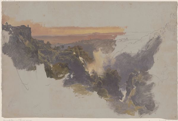 Editor: Here we have Edgar Degas’s *Landscape* from 1892, a drawing rendered in coloured pencil. I’m immediately struck by its ethereal quality, almost dreamlike. What’s your take on this piece, considering the social and historical context? Curator: It's fascinating how Degas, known for his scenes of Parisian life, dancers and the like, turns to landscape towards the end of his career. The impressionists, while seemingly focused on surface appearances and light, were often engaged in deeper questions about modern life and its relationship to nature. Given that this piece dates to 1892, well into the height of Impressionism and modern urbanism, I wonder if this landscape represents a turn away from, or a meditation upon the burgeoning industrial world? Do you think the artistic circles Degas engaged with may have spurred this change of subject? Editor: That’s an interesting point. He spent so much time capturing dancers, which feels very of-the-moment, so I hadn’t thought about this as potentially a conscious choice. But considering what you said about impressionists exploring more existential themes, this landscape seems to evoke an earlier romantic interest in sublime landscapes. Curator: Precisely! Now, looking at Degas's method, coloured pencil was, even in 1892, an easily portable, commercially produced art supply. Do you think his selection of a "low" art medium allows this work to sidestep institutional demands for what constitutes "high" art? Could this almost be seen as a quiet act of artistic rebellion against expectations, or as art made when he couldn’t make other art? Editor: That's really interesting to consider, particularly how he uses the medium. It's so different from what was going on in academic settings. Thanks, I see how considering the history helps give the artwork greater depth! Curator: My pleasure. The medium certainly makes this work fit into larger social contexts that makes it even more interesting to examine.