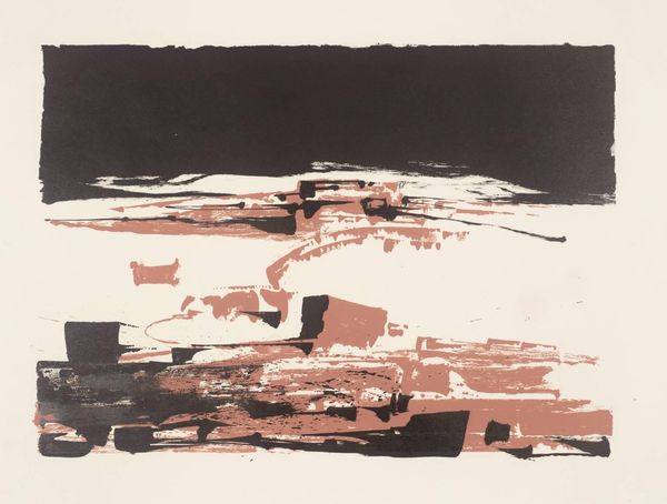 Curator: John Piper's "Beach in Brittany," held at the Tate, presents a stark and evocative landscape. Editor: It strikes me as a rather unsettling scene, despite the vibrant orange zigzags. The sharp shapes almost seem to menace. Curator: Indeed, there's a tension. The orange could represent bursts of energy but also disruption. Notice how the buildings are reduced to almost childlike forms, juxtaposed with those more threatening shapes. Editor: It evokes a sense of instability, perhaps reflecting a society grappling with rapid change, turning familiar landscapes into sites of anxiety and alienation. Curator: The simplification and abstraction invite us to contemplate universal themes of shelter versus the unknown. The beach, typically a space of leisure, is recast. Editor: Leaving me to ponder how we construct safety within increasingly precarious social and political landscapes. Curator: A powerful work, offering much to unpack. Editor: Absolutely, it highlights our shared anxieties with considerable nuance.