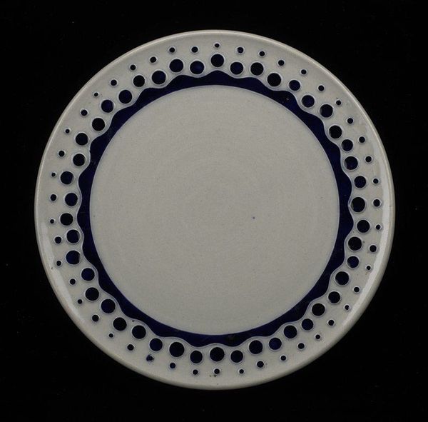 Editor: This is a "Dinner Plate" by Henry van de Velde, created in 1904. It’s a ceramic piece, specifically porcelain, currently housed in the Minneapolis Institute of Art. The simple geometric decoration and stark contrast feel very modern to me. What can you tell me about it? Curator: Focusing on materials, porcelain represents industrial ambition merging with artistry in the early 20th century. Mass production allowed for accessibility, but designers like van de Velde still labored over aesthetic detail. Look at the subtle lines, the implied motion; does that suggest a challenge to conventional high/low art distinctions to you? Editor: Absolutely, it challenges the idea of the precious object. But wouldn’t a handmade ceramic piece have had a different level of prestige then? Curator: Precisely. This plate’s value exists not only in the materials but also in the process of its creation – a marriage of industrial efficiency and artistic design, and of course the social context around consumerism, allowing wider audiences to have access to quality aesthetics. What statement does this object, and its distribution, make about daily life for the burgeoning middle class? Editor: I see what you mean! It’s no longer about the individual craftsmanship, but how design can impact a larger community. I hadn't thought about porcelain within that social framework before. Curator: Considering labor, accessibility, and shifts in material value is critical for understanding Art Nouveau objects such as this plate. It really forces us to challenge those established norms. Editor: Definitely. I’ll never look at decorative art the same way! Thanks for widening my perspective on how everyday items play into wider societal stories.