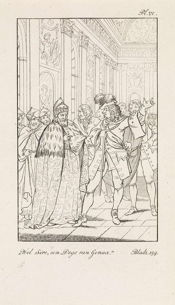 Editor: This print by Jean François Janinet, titled "The Duc de Liancourt Tells Louis XVI of the Troubles in Paris," captures a moment of high drama. The composition, almost theatrical, really emphasizes the power dynamic. What’s your interpretation of this piece? Curator: This work is a fascinating visual document of the French Revolution, reflecting the anxieties and power struggles of the time. How does the artist portray Louis XVI’s reaction, and what does this tell us about the shifting perceptions of leadership during this period? Editor: He seems…unmoved, almost? Maybe Janinet is commenting on the King’s detachment from the plight of his people. Curator: Exactly. Consider the Duc de Liancourt's urgency against the backdrop of opulent, indifferent décor. It’s a stark reminder of the social and economic inequalities that fueled the revolution. Understanding that context enriches our understanding of the artwork. Editor: That really shines a new light on everything. Thanks! Curator: It's all about uncovering the layers!