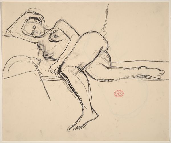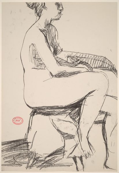 Curator: My first thought? Restless. There’s an energy to these lines. Editor: Precisely! What strikes you about this Richard Diebenkorn ink drawing, “Untitled [seated female nude reaching with right arm],” likely completed between 1955 and 1967, is this palpable tension. Note how the bold, sweeping strokes seem to define, then redefine, the figure's contours. Curator: It’s as though he’s wrestling with the form itself. You can almost sense the artist’s hand moving across the paper. The stark contrast of the ink against the white gives it an immediacy, a raw vulnerability. Editor: I concur. That rapid execution generates an evocative atmosphere, hinting at the wider Expressionist movement. Observe how the negative space carves out as much of the figure's being as the ink itself. It generates a dialectic between presence and absence, being and not-being. Curator: That’s it, isn’t it? The empty space almost amplifies her presence. I also read a hint of classical mythology—this echoes the depictions of Psyche longing for Eros, that need to grasp beyond oneself. Editor: An interesting interpretation. For me, the incompleteness is significant on its own. Diebenkorn presents us with just enough information to suggest the human form. It isn’t photorealism—instead, the focus becomes the experience and suggestion. It mirrors the fleeting experience of embodied reality. Curator: Ultimately, it compels us to consider the fragmented nature of our own perceptions. What do we see versus what do we *feel*? Editor: An elegant summation. Diebenkorn manages to translate a subjective reality through deceptively simple lines. Curator: A reminder that incompleteness can be powerfully expressive, allowing our own minds to fill in the blanks. Editor: Absolutely. A study of how what isn't depicted is frequently just as crucial as what is.