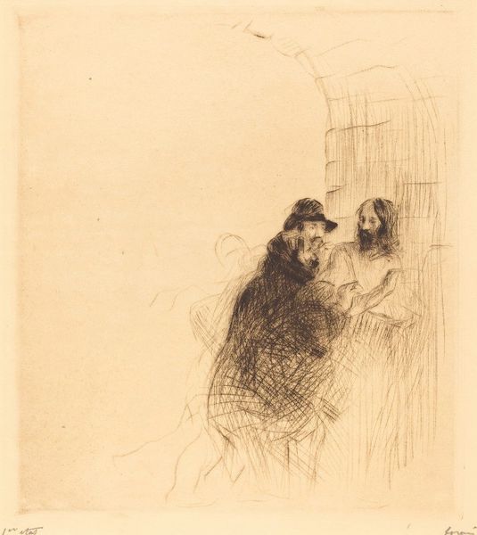 This is Jean-Louis Forain's etching "The White Slave Trade." The composition immediately presents a stark contrast, divided vertically between a lightly dressed young woman and a heavily clothed older one. Forain uses the etched line to build not just form but mood. The delicate, almost hesitant lines define the young woman and evoke a sense of vulnerability. Conversely, the older woman is rendered with bold, assertive lines which suggest her power and agency. The use of hatching and cross-hatching intensifies shadows and creates a sense of density around her, visually dominating the composition. The title suggests a narrative of exploitation, but the composition complicates such a reading. The women are linked through the linear construction of the image, which forces us to consider the dynamic between the figures. This print invites us to question not just what we see, but how the artist's formal choices shape our understanding of social dynamics.