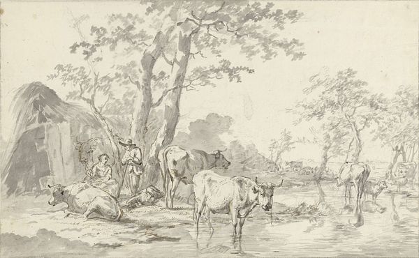 Editor: This is Robert Hills' "Sheep on the Road," a pen and ink drawing. I'm struck by how pastoral it feels, even though the road suggests movement and commerce. What does this scene tell us about the relationship between art and rural life at the time? Curator: Hills was part of a generation that helped romanticize the British countryside. These images served a growing urban audience, eager to consume idealized visions of rural life, even as industrialization was transforming the landscape. Do you notice how the sheep are rendered? Editor: They're very soft and almost seem to blend into the background. Curator: Exactly. This softness contrasts with the reality of agricultural labor, presenting a sanitized, picturesque view of rural England. The art market helped shape that vision. Editor: That’s so interesting, I didn't think about the market shaping the view. Curator: Thinking about how images are produced, consumed, and circulated really helps us understand their social impact.