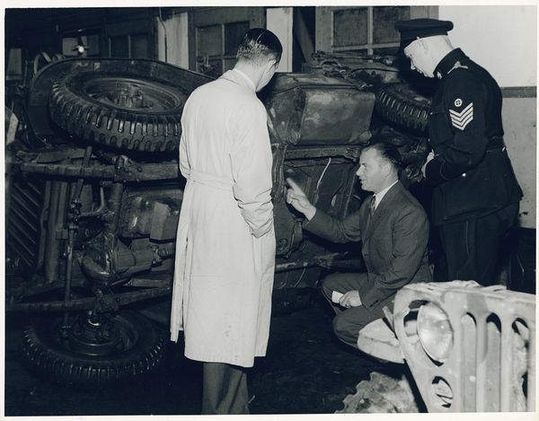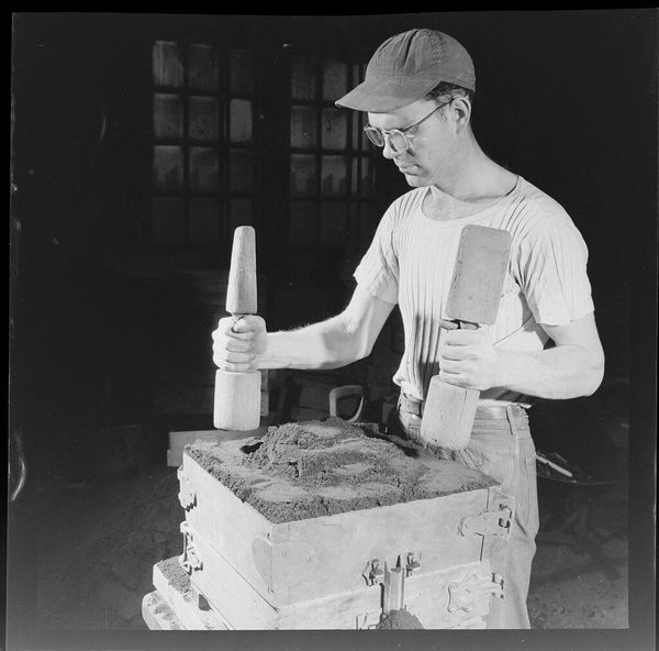 Curator: Before us is an untitled gelatin silver print, created in 1930 by Lewis Hine. The image captures a worker intensely focused on his task at a machine. Editor: It’s compelling, this grayscale study of industry. The tight focus and sharp lines emphasize the worker's intent. I am also drawn to the soft focus on the mechanical parts in the background which gives the worker a visual weight within the photographic frame. Curator: Hine was a champion of the working class, and he dedicated much of his photography to documenting their conditions and contributions, especially child laborers. The fact he gives us no title tells the viewer that this worker is a universal man and can be applied to anyone. Editor: True. Given Hine's background, one might infer the image acts as social commentary. We need to think of its broader context as he humanized industrial laborers in his photographs, a poignant statement at the time as technological advances devalued their position within factories. How might he have directed the subject to hold that expression and pose for such a message? Curator: That’s a question of intent and influence, but consider the composition itself. The curvature of the machinery mirrors the bend in the worker’s body as if to further bind his purpose to it. We should acknowledge, too, that gelatin silver prints such as this one allow for rich tonality and sharp detail—crucial for capturing both the man and the machine. Editor: Absolutely. Hine captures the dignity inherent in labor, but I find it unsettling that one man can be so important, so central, within the gargantuan industrial revolution, but utterly anonymous. Curator: It is an unsettling image on so many fronts. A reminder of a past reality and its cost, expertly crafted. I believe this piece exemplifies Hine's goal of advocating for labor reform while achieving artistic significance. Editor: A convergence, if you will, of ethics, craft and representation—giving new visual insight into the fabric of that world at the time, even through today's eyes.
