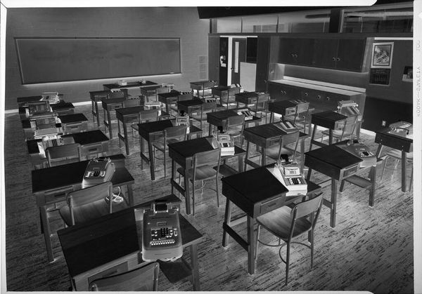 Editor: This photograph, "Untitled (appliance showroom)" by Peter James Studio, features rows of household appliances. It feels incredibly sterile, almost unsettlingly uniform. What jumps out at you? Curator: Ah, yes. It's a rather haunting image, isn't it? A symphony of consumerism, perhaps? I see a reflection of societal aspirations, the promise of modernity, frozen in time. And the appliances themselves—they're like silent sentinels. What do you make of the stark lighting? Editor: It amplifies the feeling of emptiness. I hadn't considered the 'promise of modernity' aspect. Curator: Indeed. It's as if the photograph whispers, "Is this all there is?" Food for thought, eh?
