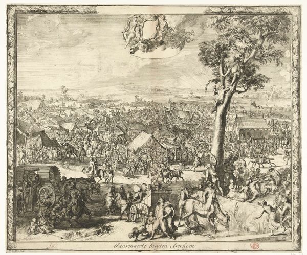 This is a black ink drawing called 'Bruiloftsoptocht', or Wedding Procession, made by Pieter Coecke van Aelst. The eye is immediately drawn to the intricate linear patterns that define the figures and the detailed urban background, suggesting a bustling city. This creates a sense of depth, but also a flattening effect. Consider how van Aelst used line and form to convey a sense of a foreign culture, employing the technique of linear perspective, yet complicating it through the density of detail, particularly in the cityscape. The use of hatching and cross-hatching not only describes form but adds to the overall texture of the piece. The linear style and meticulous detail can be seen as van Aelst’s attempt to capture the essence of another culture through the graphic language available to him, referencing a semiotic system to translate and preserve the image of a foreign land. The detailed rendering encourages close inspection, revealing a complex interplay between representation and interpretation. As you observe, think about how the structure informs its meaning, inviting us to question the nature of representation and the cultural codes embedded within the artwork.