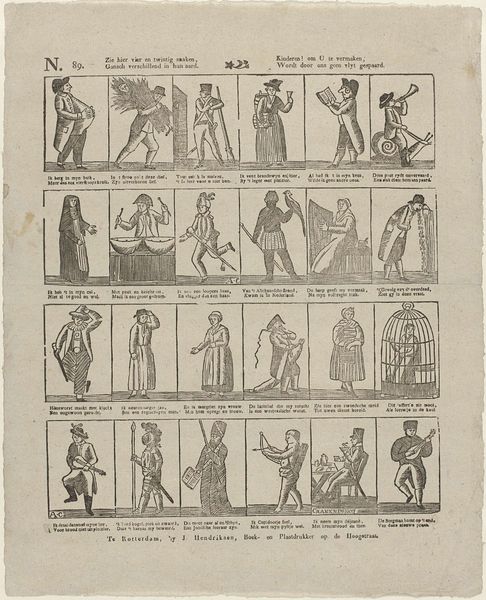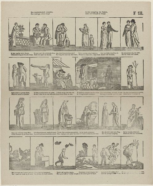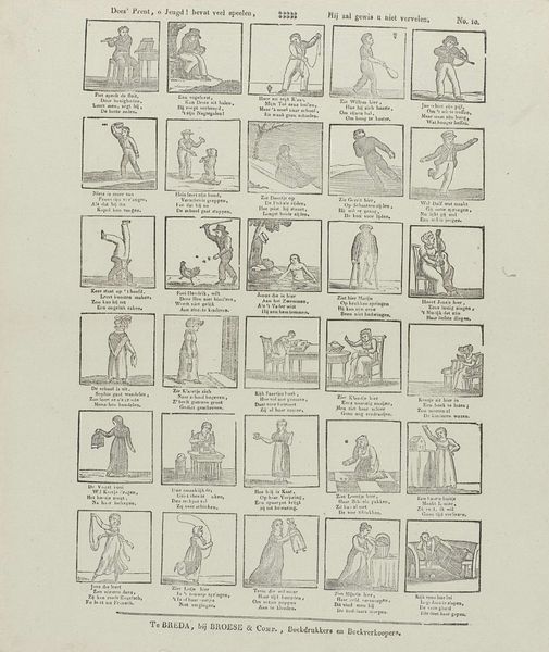 This print titled, *Vaderlandsche Spreekwoorden*, or National Proverbs, was created by Broese & Comp. The series of images visualizes a host of Dutch sayings, offering a glimpse into the cultural values and social norms of the Netherlands. Looking closely, we see representations of everyday life, gender roles, and social expectations which are subtly reinforced through the proverbs. How do these sayings reflect the experiences of women, or those of different social classes? Consider the saying, “That which is given is better than to beg.” It speaks to the complex negotiations of power and dependency. The sayings act as little lessons, offering advice on everything from managing finances to maintaining social relationships. They remind us that language and visual culture are always intertwined with issues of identity, history and power. The prints create a mirror reflecting not just individual behaviors, but broader societal structures.