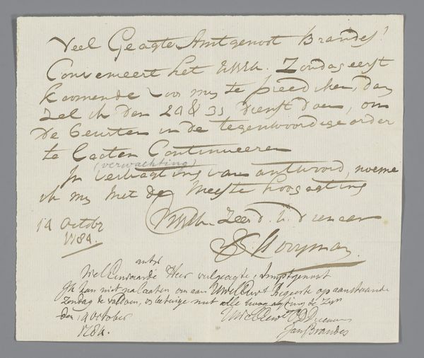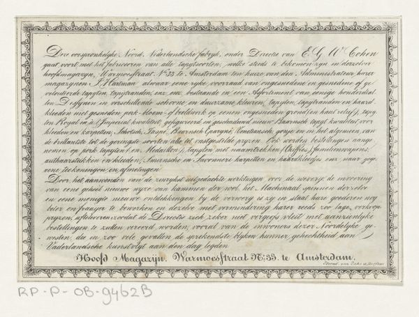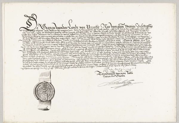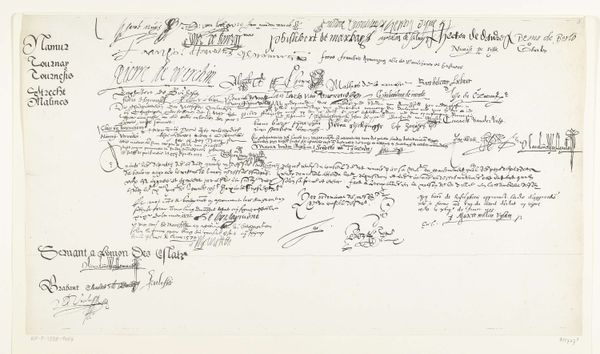 Daniël Abrahams created this historical facsimile in the 19th century. What strikes you first is the interplay of dense, dark script against the stark white of the page, creating a visual hierarchy. The main body of text is meticulously inscribed, offering a structured block that grounds the composition, while the signatures below sprawl with a more fluid, almost chaotic energy. Consider how Abrahams uses line and form to represent order and individuality. The formalized script speaks to institutional authority and the uniformity of law, yet the varied signatures introduce a human element. Each stroke, flourish, and pressure point becomes a signifier of personal identity, disrupting the homogeneity above. This interplay is a fascinating example of semiotic tension, where codified language meets the expressive mark of the individual. The document challenges fixed meanings by layering personal inscriptions, effectively destabilizing the authority of the central text. It becomes a palimpsest of power and presence, capturing a moment of collective agreement infused with individual assertion.