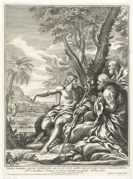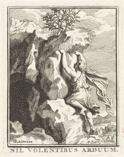 Curator: What a fascinating print! This is “A man lies under a tree,” made in 1717 by Bernard Picart. It's currently held in the Rijksmuseum. Editor: My initial impression is one of tranquility disrupted. There's a reclining nude figure seemingly startled in a serene landscape with animals—goats, dogs, even rabbits. It feels like a moment of realization intruding upon Arcadia. Curator: I agree, there's definitely a narrative tension. Looking at Picart’s process, it's fascinating how he used the precise lines of engraving to create a detailed yet ethereal atmosphere. Think about the labor involved in each individual line etched onto the plate, replicated for numerous prints intended for wide distribution. What was the audience? And what materials would have been used in creating the physical object that they held in their hands? Editor: Precisely! And given that, let’s contextualize a little. It's interesting that the print contains the words: "Who am I? Where am I? Where have I come from?" next to a naked, awakening male figure—suggestive of enlightenment or perhaps an interrogation of male power structures emerging in the eighteenth century? The choice to represent that question through the male nude specifically also hints at how ideas around morality intersect with concepts of art. What statements does that make? Who does it exclude? Curator: It’s true, examining those prints closely really unveils so much, not only the artist's hand but the whole socio-economic picture around printmaking at the time. From the paper mills that provide material to printmakers finding a market in urban centers--this image acts as window into a bustling production network. Editor: Indeed. Ultimately, art isn’t produced in a vacuum. Exploring its production, circulation, and reception opens up crucial pathways to thinking about ourselves in the present, our histories, and the many diverse hands that helped create them. Curator: Absolutely. Seeing how the very materials and processes themselves carried social and economic weight offers vital insight, broadening our grasp on how visual representation both influenced, and was shaped by, larger society at the time.