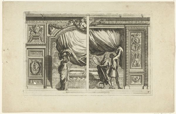 This print, of Moses Standing by the Ark of the Covenant, was made anonymously using woodcut. This is a relief printmaking technique, where the image is carved into a block of wood, with the remaining surface receiving the ink. In this work, the linear quality characteristic of woodcut is clearly on display, particularly in the drapery and architectural elements. Look closely, and you can see how the artist has used the parallel lines and cross-hatching to build up tone and texture. The medium is inextricably linked to the message: the relative ease of producing woodcuts made them ideal for the wide dissemination of biblical imagery. The stark contrast and simplified forms lend the scene a directness, intended to educate and inspire the viewer. The artist, in choosing this more popular medium, engaged with a tradition deeply rooted in the social and cultural life of the time. Ultimately, this print stands as a testament to the power of accessible art, and its potential to shape understanding and belief.