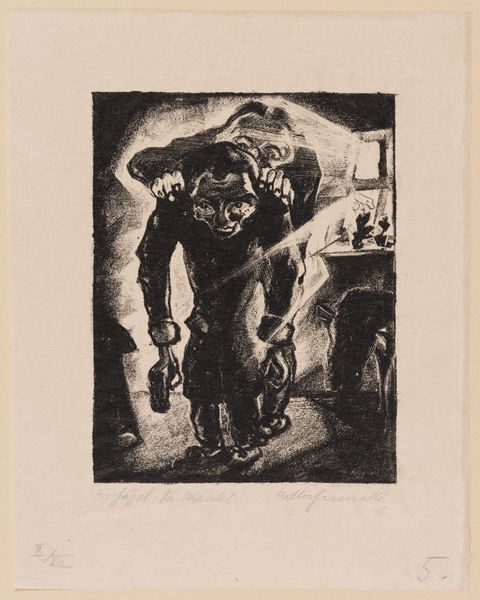 Curator: Walter Gramatté's striking print, "Akaki in a Coffin Made of Spruce Wood," presents a poignant image. Gramatté, a German expressionist, engages with themes of mortality and societal alienation. Editor: It's intensely melancholic. The stark black and white emphasizes the figure's vulnerability. You just want to reach out, you know? Curator: The artwork, located at the Harvard Art Museums, offers a visual commentary on the plight of the marginalized, drawing parallels to Nikolai Gogol's "The Overcoat," a tale of societal indifference. Editor: I see that. The raw, almost childlike lines capture the isolation that so many experience. It's as if his very being is being swallowed by the darkness around him. Curator: Absolutely. Gramatté uses the coffin as a metaphor for social constraints, highlighting how systems of power can literally bury individuals. Editor: It's uncomfortable, but that's its strength, isn't it? To remind us of the Akakis among us. Curator: Precisely. Gramatté's work challenges us to reconsider our roles in perpetuating or dismantling systems of oppression. Editor: Well, it certainly made me think. I appreciate that, you know? That something created so long ago can still sting.