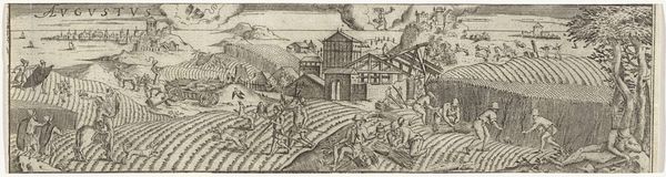 Editor: This print, called "Oktober," dates back to sometime between 1554 and 1641. It's unsigned, from an anonymous artist, but hangs here at the Rijksmuseum. It depicts what appears to be village life. What catches my eye is the contrast between the dark, active scenes on the left and the lighter, more agricultural scenes on the right. How do you interpret this work? Curator: Look closely at the symbols of labor and harvest, and what feelings do these evoke? "Oktober" seems to be more than just a genre scene; it encapsulates the spirit of autumn. Notice how the figures engaged in wine-making on the left create a kind of enclosed energy, almost a chaotic vitality, while on the right, gathering the harvest seems more tranquil. Editor: I do see that now. What’s interesting to me is the focus on community - everyone is working together. Curator: Exactly. And consider what "October" might have symbolized in the 16th and 17th centuries, times of immense religious and social upheaval. The print presents not only the natural cycle of seasons, but a subtle cultural memory. Do you recognize the way collective work strengthens community identity, providing a continuity against any disruption? Editor: Yes, now that you mention it, I get that sense of stability, maybe even defiance, through shared effort and tradition. Curator: The beauty of such images resides in how they can carry layered meanings. On one level, it celebrates a month's labor. On a deeper level, "Oktober" is a testament to shared traditions against changing times. And from these dark ink lines emerge lasting symbols of togetherness and endurance. Editor: I never would have seen all of that. This makes me appreciate not just the image but its enduring message about community and resilience even more. Curator: Indeed. And isn't it fascinating how a simple print from centuries ago can still speak to our modern longing for community?