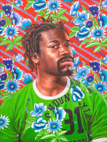 Curator: Monica Ikegwu's 2021 painting "Junior" is a powerful example of contemporary figurative work rendered in mixed media. My first impression is quite strong; the painting seems serene, yet a little haunting. The palette of cool blues and greens creates a muted almost ethereal atmosphere, enhanced by the soft folds behind the figure which create an angel wings allusion. What do you make of this? Editor: Haunting, yes, definitely an interesting take. I see how the implied wings and somewhat angelic treatment of the main figure would convey that idea. This portrait sits at an intersection of visibility and vulnerability that I find particularly relevant within the context of the continued struggle for Black representation. In today's media, there is often misrepresentation. I like how Ikegwu offers a counternarrative here. Curator: I agree, that feels insightful. Considering that counternarrative, what do you think is communicated through his holding his cell phone? Editor: Well, technology plays such a complex role. It can isolate, but it also connects and empowers marginalized communities. It provides a space to express counter-narratives in the face of injustice and provides direct access to news without any censorship from external sources. By focusing the light in the work onto the phone, Ikegwu seems to be using the phone as a symbol of access and, as he gazes upon it with that intent and vulnerable expression, as something quite personally essential. Curator: Yes, the luminous quality you've identified definitely elevates the phone to almost a symbolic object and considering institutional art history that generally overlooked Black men, seeing this modern everyday activity rendered so reverentially does resonate deeply. And of course the gentle glow from the device adds a visual focus, further emphasizing the weight of that single interaction in our ever-connected digital age. Editor: Precisely. Plus the words “You too...” featured prominently on his clothing really hit differently when considered as a conversation or declaration, which is open to diverse interpretations. Is the speaker responding or instigating? Who are the "you" and the "too" implicating here? I find the possibility of meaning generated from this piece exciting to see play out within its varied audiences. Curator: Indeed, this ambiguity further enriches Ikegwu's powerful exploration. Her insightful combination of formal art practices with the subject’s self-presentation raises compelling questions around identity, connection and the social framework which shapes our understanding of these portraits. Editor: I wholeheartedly agree. "Junior" leaves us contemplating not only the sitter's individual story but also the larger historical forces shaping how we perceive individuals within society.