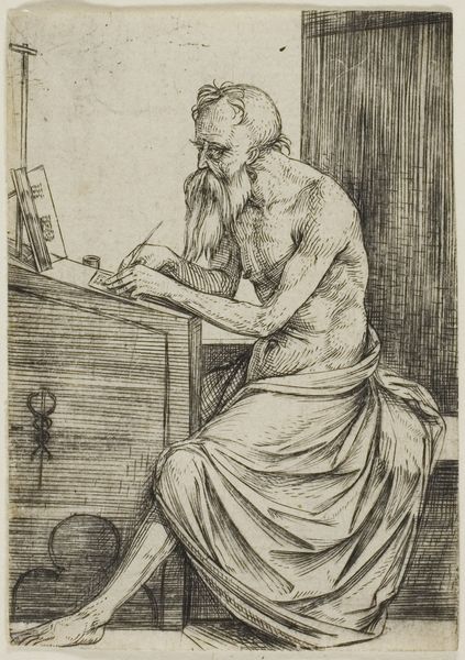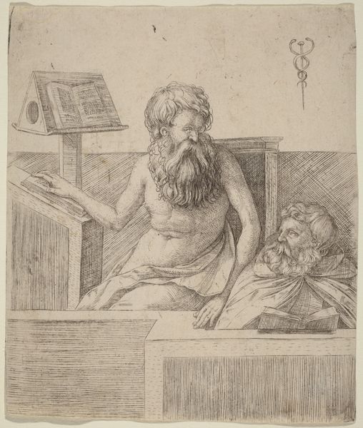 Curator: Jost Amman created this engraving titled, "Wenzel Jamnitzer: Goldsmith, Mathematician, Designer of Instruments." Editor: The textures are striking; the hatching creates depth, but also feels almost oppressive. It is like the weight of thought made visible. Curator: Indeed. Consider how the print underscores the cultural importance of artisans like Jamnitzer. This was an era where craft and intellect were deeply intertwined. Editor: The lines themselves are fascinating. Note how they construct not just form but also light and shadow, almost diagrammatically. The hourglass and geometrical solids emphasize a preoccupation with time and space. Curator: These instruments signify not just mathematical precision, but the status and intellect associated with these pursuits at the time. This engraving served to elevate Jamnitzer's position within society. Editor: Perhaps, but it is the spatial logic, so carefully rendered, that captures my attention. Curator: Ultimately, this work reveals the fusion of art, science, and society during the Renaissance. Editor: Yes, a moment captured with striking geometrical intensity.