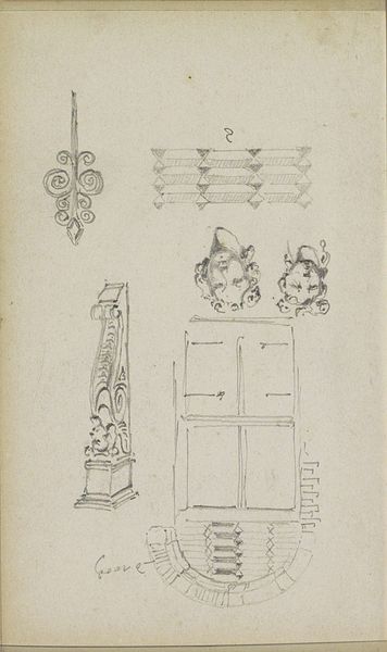 Curator: This is Isaac Gosschalk’s graphite and pencil drawing, "Fronton van een gebouw te Hannover," created between 1866 and 1868. Editor: It has a tentative, almost ghostly quality. The sketch-like nature makes me think of lost histories and architectures. Curator: Note the careful rendering of architectural details—the lines are economical yet precise. Look at the geometric solidity achieved with just graphite on paper. Editor: But beyond that, I see a potent reminder of societal upheavals during that period, right after the Austro-Prussian war when the Kingdom of Hanover was annexed by Prussia. It's a fleeting capture of something about to be erased. Is this drawing meant to serve some act of remembrance, resistance? Curator: Perhaps. But what commands attention is Gosschalk’s ability to suggest depth and volume. The shading and subtle gradations bring out the baroque intricacies of the building’s fronton, a hallmark of classical architecture reinterpreted in 19th-century civic design. Editor: I'm drawn to the multiple views presented here – not just one facade but fragments, alternatives. This speaks to the subjective act of observing, almost challenging a singular, dominant narrative. It invites multiple readings of a place marked by conflict and transition. Curator: Undoubtedly. Though what also fascinates me is its status as a study, a prelude to a potential building or simply an exercise in form and perspective. The material itself prompts such observations – think of the grain of the paper, the specific hardness of the graphite pencil... Editor: All the same, I'm hard-pressed not to read the cityscape, sketched with such vulnerable strokes, without acknowledging its complicated birth and subsequent disappearance. How the architectural fronton speaks, or *spoke*, to power is not an entirely absent question, is it? Curator: Perhaps this ephemeral quality lends the drawing its unique beauty, don't you think? It's more than just a depiction; it’s an exploration of the possibilities within the act of drawing itself. Editor: True, its fragility does add to the resonance—a quiet whisper from a period of dramatic transformation.