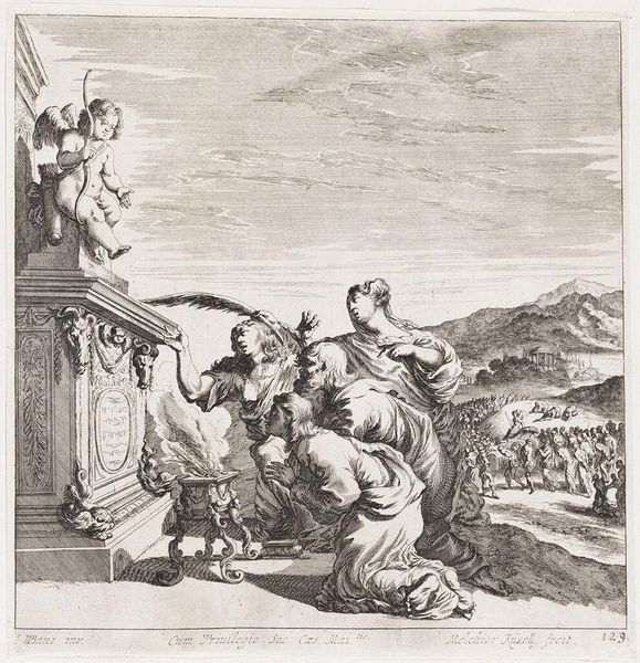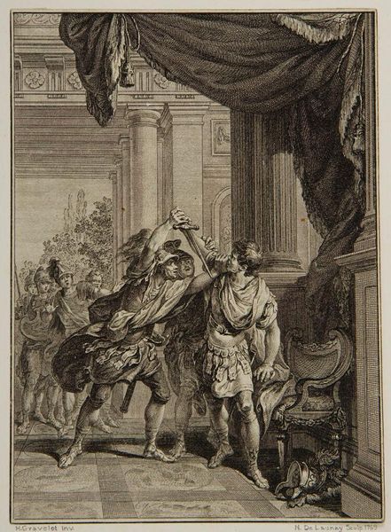 Editor: This is Jean Jacques Leveau's "Scene from Voltaire's 'Oreste'," an etching. It has a very theatrical feel, almost like a stage setting. What symbolic meanings do you find in this scene? Curator: Notice how the figures are positioned near classical architecture and statuary. These elements evoke themes of justice, fate, and the weight of history. Do you see the emotional tension conveyed through gesture? Editor: Yes, there's a clear contrast between the figures carrying what seems to be a body, and the women recoiling in horror. Curator: Exactly. The scene visually encapsulates the play's themes of revenge and its psychological consequences. This etching serves as a cultural memory, echoing the play's themes. Editor: So it's less about historical accuracy and more about capturing the play’s enduring impact? Curator: Precisely. Symbols layered upon symbols, creating a powerful emotional resonance across time. Editor: That gives me a new appreciation for how images can carry so much cultural weight.