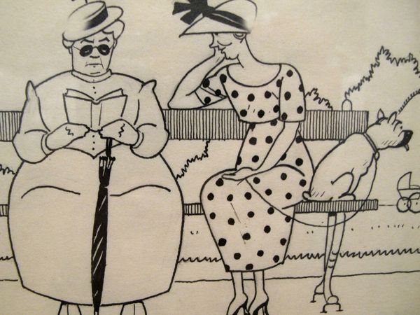 Editor: This is an untitled drawing by Gerda Wegener. I am struck by the contrasting figures: the thin flapper with her guitar and the corpulent man smoking in the chair. There's also a nude on an easel, within a decorated oval frame. It feels subtly satirical. What do you see in this piece? Curator: The frame, the figures... all speak to the artifice of image construction itself. Wegener is, in her time, part of a milieu critiquing bourgeois society even as she gains visibility within it. This is a period fascinated by, and anxious about, shifting gender roles, visibility and display of sexuality, and the art market that turns those subjects into commodities. Editor: The woman *is* presenting the painting, almost selling it. Curator: Exactly. Consider the power dynamics: Who controls the gaze? The artist? The sitter? The presumed patron represented by the smoking man? Wegener cleverly stages these questions. The art nouveau style softens the critique, rendering it palatable for the very audience it skewers. How might we interpret the guitar she's holding? Editor: Perhaps a reference to another form of performance, or display? Something to heighten the scene's overall decadence? Curator: Yes. And remember, Wegener herself challenged conventional roles. Knowing her biography perhaps enriches the reading of power within the scene itself. What new perspective did you get on Wegener? Editor: Thinking about the context of gender roles really clarifies Wegener’s positioning and highlights the complex layers within what I initially saw as a somewhat simple composition.