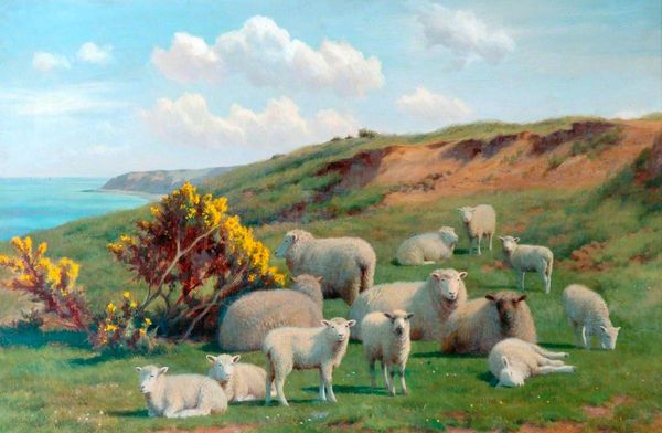 Editor: So, this is “The Flock” by Enrico Nardi, it seems to be an oil painting. There's this incredible sense of movement with all the sheep pressing together. I'm really curious about the overall impression it leaves. What is your read on this piece? Curator: Well, when I look at Nardi’s “The Flock,” I'm immediately struck by its depiction of rural life and the inherent power dynamics within it. Consider, who commissioned this painting? Was it intended for a private collection or a more public display? The portrayal of the flock as a collective, almost anonymous mass invites consideration of the working class and their relationship to the land. Editor: That's interesting. I hadn't considered the context of who would view it and their socio-economic status. I was so focused on just the aesthetic quality and texture of the sheep. Does the composition also play into that reading? Curator: Absolutely. Note how the flock dominates the composition, nearly obscuring the human element implied by the barn and fences. Think about the late 19th/early 20th century and the rise of industrialization. Genre paintings depicting agrarian scenes like this often romanticized rural life, potentially masking the harsh realities of agricultural labor. Does Nardi perpetuate this romanticization or challenge it? Editor: That makes me think… the painting feels very…neutral. There is neither critique nor idealization, and maybe that invites the viewer to confront their own preconceptions about farm life? Curator: Precisely! The neutrality you perceive may reflect a deliberate artistic choice, subtly engaging the viewer in a broader dialogue about labor, land, and social structures. It moves past the simple aesthetics. Editor: That's a completely different lens than how I usually look at art. Thank you! It really highlights how artworks aren’t just things of beauty, but can be these rich sites of cultural and social meaning.