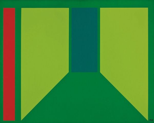 Editor: So this is "Another Time" painted in 1973 by Kenneth Noland, using acrylic paint. It's a diamond shape filled with a kind of leafy-green color, crossed by colored stripes. It reminds me a bit of a minimalist plaid. What are your thoughts on it? Curator: The painting exists in a period marked by intense social upheaval and the questioning of traditional norms, especially within the Civil Rights and Feminist Movements. The geometric shapes and the 'hard-edge' painting style speak to a desire for clarity and order amid that chaos. I see its composition not just as abstract geometry, but as a response to and a reflection on a specific socio-political landscape. Do you think the title "Another Time" might hint at an imagined future or an idealized past? Editor: That's interesting, I hadn't thought about it in terms of the social context. I was just seeing a pleasing design, but, yes, it could represent longing – maybe a rejection of the present? Is the colour palette significant, do you think? Curator: Absolutely, the earthy tones, in contrast with the industrial feel of the acrylic and hard edges, complicate the image. The green may recall a longing for nature. Consider its implications within the larger narratives of environmentalism gaining traction in the '70s, and how these relate to issues of land ownership, indigenous rights, and resource extraction that are very relevant today. How does that strike you? Editor: I see it now, I am seeing the conversation, it suggests about a more ecological sensibility and longing that exists against a context of social change, a need for simplicity and clarity of thought! I might have been too focused on formal elements. Curator: It is all about drawing the connections, seeing the artworks as the products and the agents of their time. It shifts our understanding beyond the purely aesthetic! Editor: Thank you. I’ll definitely be paying closer attention to the historical and social context from now on.