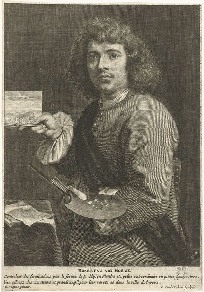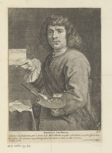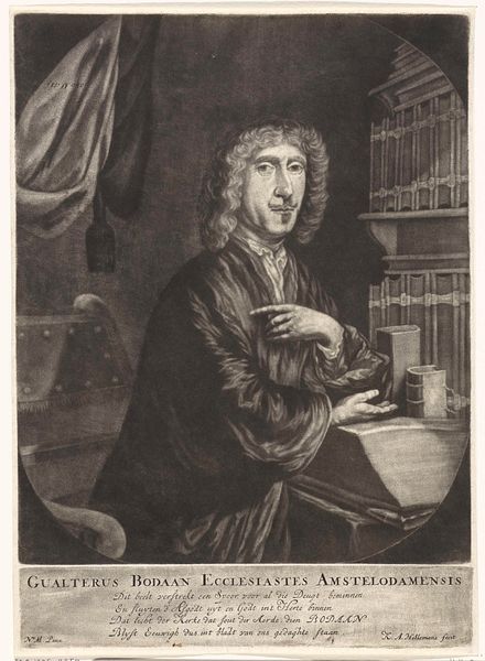 Curator: This intriguing piece is titled "Portret van Gualterus Boudaen," created sometime between 1650 and 1699 by Cornelis A. Hellemans. It appears to be executed in charcoal, maybe with watercolor elements as well, offering a subtle grayscale palette. Editor: Ah, he's got that whole 17th-century intellectual vibe, doesn’t he? Sort of melancholic, pointing dramatically like, "Read this book or face my eternal disappointment!" I like the chiaroscuro; it’s all moody and atmospheric. Curator: The stark contrast certainly enhances the sense of drama. The formal arrangement, a seated portrait with books, signifies Boudaen's scholarly profession. Consider the semiotics of the hand gesture; it could be interpreted as didactic, even accusatory as you pointed out, yet inviting in another way. The use of charcoal lends a certain softness. Editor: Right, that softness is key. It keeps it from being too severe, adding a touch of humanity to an otherwise formal pose. There’s something appealing in the slight imperfections of the medium, compared to slick oil paint. It's like peeking behind the curtain of the official portrait. Makes you wonder what he's really like! Maybe he was fun at parties… Or maybe I am just projecting. Curator: I agree about the medium being the strength. The charcoal allows the artist to focus on the contrasts within light and dark. There are few overt symbols, so this portrait hinges mainly on its formal execution and the psychology of the sitter as it is expressed through line, texture, and value contrast. The materiality adds a degree of verisimilitude. Editor: Well, Cornelis A. Hellemans really nailed that slightly judgmental gaze then. It’s strangely compelling, this austere yet intimate glimpse into a long-ago person. I imagine that charcoal portraiture such as this may represent the era's approach to both honouring an individual's status and reflecting on deeper human questions of personality. It seems much easier to judge and dissect today. Curator: Ultimately, this portrait offers us a structured yet textured glimpse into a past era's artistic and social conventions, a study in both form and the enduring quest for portraying human essence. Editor: I like that: form *and* essence. Yep. Now if you’ll excuse me, I have a book to go read before someone starts pointing fingers.