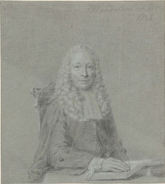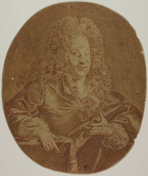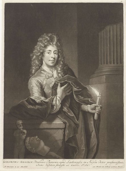 Curator: Jacob Houbraken rendered this portrait of Godfried Schalcken sometime between 1708 and 1780. It’s a charcoal drawing now residing here at the Rijksmuseum. Editor: My immediate impression is one of mystery. The tonality created by the charcoal imparts this sense of gentle age, or perhaps a sort of faded glory about the subject. What draws the eye for you? Curator: The technique really stands out. Consider the way Houbraken utilized charcoal—typically a preliminary medium—to produce such a finished portrait. It blurs that line between preparatory sketch and artwork itself, defying strict hierarchical art categories. Editor: That blurring interests me too, especially thinking about Schalcken as an artist famous for his candlelight paintings. Look at how Houbraken mimics this source of light through the dark depths of charcoal and then the highlights throughout the piece. Curator: And Schalcken holds this candle... he appears to have mastery of this object. Are we seeing tools that are connected to craftsmanship here? What meaning do we attach to this gesture or pose? Editor: I think so. I would agree, by showing him holding a tool central to his art, Houbraken communicates how candlelight became Schalcken’s hallmark. Beyond mere physical light, it speaks of the ‘inner light’ or illumination a great artist possesses. He quite literally and figuratively holds that. Curator: His art, of course, found patronage among Europe’s elite; there was real value placed on Dutch Golden Age artistry and craftsmanship. Consider the consumer value of his portraits and their cultural reach; How did an object created under his skilled hands accrue significance beyond mere surface-level representation? Editor: Good point. I can’t help but focus on his confident gaze and slightly parted lips as well. Perhaps there is the idea of whispered secrets to which only true artists know. Curator: So the piece invites us, doesn’t it, to reflect on the means of artistic production, to examine a single drawing made in the Baroque era as representative of greater themes in materiality, value, and labor. Editor: Precisely. Looking deeper reveals echoes that bounce from symbolism and artistic identity back into time itself, illuminating stories that have been obscured by age and changing context. It's an almost ghostly revelation.