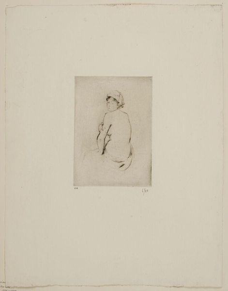Editor: Here we have Manet's tiny etching, "Profile of Baudelaire Wearing a Hat." It’s so delicate and sparse, almost like a whisper. What do you see in this fleeting glimpse of Baudelaire? Curator: It's a mere breath, isn't it? Yet, within those few lines, Manet captures Baudelaire's melancholic air, that dandy-esque pose concealing a troubled soul. The hat… a symbol, perhaps, of the poet's attempt to both fit in and stand apart from Parisian society. Editor: So, the hat is like a mask? Curator: Maybe. Or maybe it's just cold! But it speaks volumes about their friendship. These two rebels, kindred spirits in a world they both loved and critiqued. Editor: I never thought such a small image could say so much. Thanks for that insight! Curator: My pleasure! Art often speaks in whispers. We just have to listen closely.