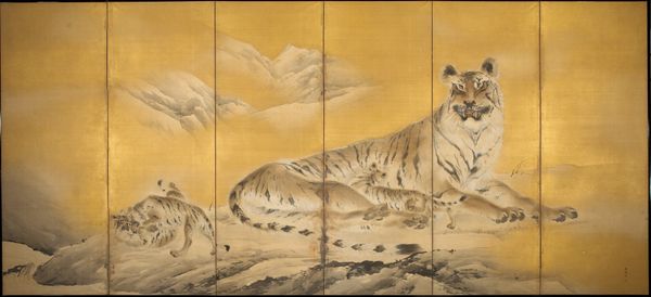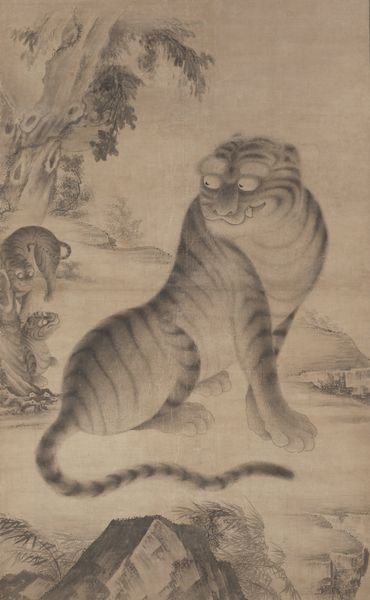 Editor: Here we have Katsu Gyokushu’s “Seated Tiger” from 1786, rendered in ink and tempera. The tiger itself has a very lifelike presence, almost piercing. How would you interpret this work, thinking about the choices of material? Curator: I find it fascinating to consider how the materials – ink and tempera – directly affect the reception of this "realistic" image. Gyokushu wasn't simply depicting a tiger; he was participating in, and perpetuating, a specific kind of commodity. Can you think of what labor was necessary to make the painting materials available? Editor: Right, the process of making the ink and preparing the tempera would involve different specialized labor, shaping how it was consumed as an artwork. Curator: Precisely. Tempera's earth pigments link it to landscape itself; the ink reflects its own making. The calligraphy and seals become markers of the painting's journey as a valued object. This interplay reminds us that even ‘naturalistic’ images are deeply rooted in production and social exchanges. Think about its acquisition: by whom, and from where? These layers impact the symbolism we often ascribe to a tiger, independent of the act of artistic production. Editor: So, instead of seeing just a portrait of a tiger, we should consider it as an artwork enmeshed within historical means of artistic production and the economy in the late 18th century? Curator: Exactly. It’s less about inherent symbolism and more about what the making and exchange of such an object represents within its cultural moment. I'd love to know who first owned it. Editor: This perspective definitely gives me a new way to approach art history. I will be more thoughtful of where all these paintings and their materials originate from. Curator: It provides us with concrete understanding of its existence, hopefully challenging romantic visions about creation and its impact on the market value of works like “Seated Tiger.”