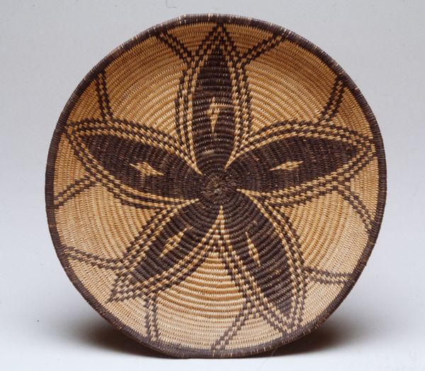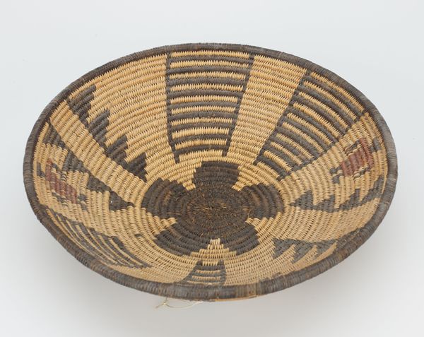 Curator: Here we have an Apache basket, likely created in the early 20th century. It’s part of the Minneapolis Institute of Art’s collection. Editor: Right away, I'm drawn to the sheer patience embedded in this piece. Each coil a testament to dedication. It's mesmerizing. Curator: Absolutely. Think about the indigenous Americas, and how geometric designs often weave in not just aesthetics but complex narratives, even cosmologies. What stories do you think these repeating patterns are trying to tell us? Editor: Well, circles are nearly universal symbols, right? Eternity, the cycles of life. The star-like burst at the center could signify connection, community, the weaving together of individuals. But those diamond-shaped figures—are those eyes? Are they watching? Curator: Interesting thought! In Apache tradition, certain geometric designs were believed to provide protection. I wonder if that "IBX" stitched into the side holds similar meaning. Editor: It does shift the energy slightly, doesn’t it? Introduces an individual maker’s mark, or perhaps an owner’s identifier. Takes it out of pure ritual object, perhaps moves it closer to personal expression. The brown against the muted background adds so much depth and intrigue. Curator: It's fascinating to see these intersections of cultural expression and possible external influences. Baskets, especially those made by indigenous communities, become containers not just of physical items, but of complex stories. Editor: It is a beautiful object. In it I think one can see both personal and cultural stories subtly intertwining. It leaves a gentle yet lasting impression. Curator: A truly stunning piece that speaks volumes in the visual language of tradition and craftsmanship.