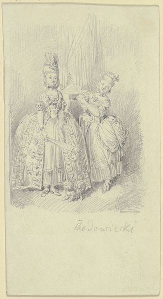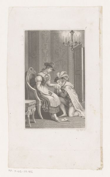 Editor: This is a photograph from between 1860 and 1890, titled "Fotoreproductie van (vermoedelijk) een prent naar werk van W. von Kaulbach: Eugénie (Natürliche Tochter)," currently held at the Rijksmuseum. It’s an albumen print that appears to be a reproduction of a painting. The image depicts two women in what looks like an opulent interior. The woman seated appears to be dressing for an event, perhaps. I am curious about the dynamics between the women. How do you interpret this work? Curator: That’s a perceptive question. While seemingly a simple genre scene, this work exists at the intersection of photographic reproduction, romantic aesthetics, and societal expectations of women. The fact that it’s a photographic reproduction of a painting already raises interesting questions about originality and access. How does the photograph democratize or perhaps distort the original painting’s message? Editor: I never thought of it that way. It seems very meta – a photo of a painting. Curator: Precisely! And the romantic style combined with academic art ideals tells us much about the historical context. Consider the title; "Eugénie (Natürliche Tochter)" suggests a narrative focused on an illegitimate daughter. Given the era, the "fallen woman" was a prevalent trope often used to moralize and control female sexuality. Does the image support or subvert this trope? What narrative is embedded in her elaborate dressing ritual? What does the other woman in the scene signify in this act? Editor: It sounds like maybe the photo and the painting before it were made for a very specific audience with specific beliefs about women and their roles in society. I learned so much! Curator: Yes, analyzing its composition through a contemporary lens allows us to question and deconstruct those historical power dynamics. Every artistic decision can be seen as participating in a broader cultural conversation.