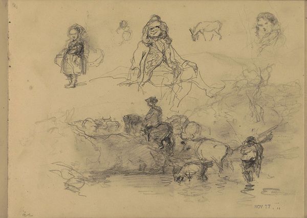 Curator: I’m struck by the intimate feeling of this sketch, like stumbling upon the artist’s private thoughts. Editor: Indeed. We’re looking at “Studieblad met verschillende historische figuren”—Study Sheet with Various Historical Figures—attributed to Willem Pieter Hoevenaar, created sometime between 1818 and 1863. It’s currently housed here at the Rijksmuseum. You know, what draws me in is the density of images, all these faces and figures clustered together like characters in a forgotten myth. Curator: Precisely! It is intriguing. The clustering might reflect the 19th-century academic focus on historical narratives. These could be studies for larger, more formalized works, reflecting the historical genre-painting popular during that period, and Hoevenaar's involvement with groups like the Felix Meritis society is noteworthy in the proliferation of art for the public good. Editor: And they all have this faintly theatrical air. It's like watching actors between scenes, each lost in thought, and these characters repeat throughout art history--a man on a horse, figures gathered talking to one another... they seem so archetypal. I wonder, were the hats indicative of anything significant to period viewers? I see a common visual marker uniting these figures. Curator: The hats, you’re right, are prevalent and denote social standing or perhaps specific historical eras Hoevenaar was interested in representing, reflecting back to academic values around historical fidelity, costuming, and detail to construct realism and project values to contemporary viewers. It’s an early period of what we know now about visual symbolism and political projections, for instance. Editor: So, these symbols were really working hard culturally? As preliminary sketches they would have helped to fix ideas as well. To me, their incompleteness gives a vulnerability and insight into their working method that a polished history painting lacks. It shows you how much time the artist took. Curator: The act of sketching itself gained prestige as part of the romanticisation of an artists own hand as touched by genius at the time. In many ways they are as relevant as more "finished" pieces. The Rijksmuseum gives these the prestige that would have been initially denied these "studies." It's important in thinking about the artwork's journey after the artists is gone. Editor: The psychological effect of unfinished quality is fascinating to think about now--thanks! It certainly adds layers to the whole narrative. Curator: Glad to bring a different lens to your impression of this fantastic piece!