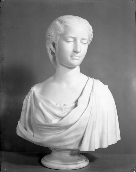 Editor: This marble sculpture, created in 1863 by H.W. Bissen, depicts Queen Louise of Denmark. What immediately strikes me is its rather stoic and somewhat cold demeanor, especially when you consider it's a portrait meant to honor royalty. What can you tell me about it? Curator: That perceived coldness speaks volumes, doesn’t it? In the mid-19th century, neoclassicism still held significant sway. Royal portraits in sculpture served less as intimate glimpses into personality and more as assertions of power, legitimacy, and connection to the lineage of empires past. Consider the political climate; Denmark was in a period of nation-building, trying to solidify its identity. Editor: So, the style served a political function? Curator: Absolutely. Academic art, particularly portraiture, operated as a form of propaganda. Bissen, a prominent sculptor of his time, consciously uses this classical language to ennoble Queen Louise and, by extension, the Danish monarchy itself. It's less about individual likeness and more about projecting an image of unwavering authority. How do you think the public received such imagery at that time? Editor: I imagine it would reinforce the established social order, legitimizing the Queen’s position. Almost like a carefully staged photo op of the time, meant for widespread consumption and reinforcing ideals. I never thought about art in this period as staged with this goal! Curator: Precisely. And, the display of the sculpture itself within the museum further reinforces these messages. Public art serves a public function; this piece reminds us of how even seemingly neutral representations can participate in power dynamics and ideological reinforcement. Editor: It's fascinating how historical context completely reshapes my understanding. It adds a whole other layer to simply appreciating its aesthetics or skill! Thank you! Curator: Indeed. Thinking about the ‘why’ and ‘where’ art exists truly enriches our engagement with it.