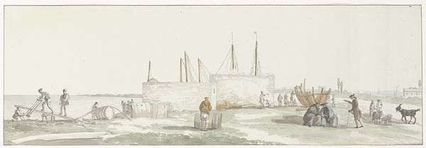 Curator: Here we have Louis Ducros’ "View of the Castel Sant'Angelo in the harbor with galley ships in Malta," a watercolor from 1778. It's currently held in the Rijksmuseum. Editor: The scene feels incredibly serene. There’s a hazy, almost dreamlike quality to the light that softens the architecture and the ships. It's more muted in color than I would expect of that location; the details are precise, yet there’s this overarching atmosphere of quiet observation. Curator: Indeed. Ducros’ landscapes offer more than scenic beauty; they illuminate Malta's socio-political landscape in the late 18th century. The Castel Sant'Angelo itself served not only as a defense but as a symbol of power – reflecting the influence of the Knights of Malta, and the harbor’s strategic role. His choices in composition likely had political implications. Editor: Right. And considering his wider body of work and its engagement with political and social issues across Europe, situating this particular piece within that broader context would seem crucial. One can almost see the beginnings of colonial contestation shaping the very landscape, even if rendered with a gentle hand. Curator: Precisely. Moreover, Ducros' decision to capture it in watercolor is significant. Watercolor painting, at the time, was often seen as preparatory work. Could his medium choice also be interpreted as speaking to Malta's place as a transit point, between empires? A state that never fully stood on its own? Editor: Fascinating point. It encourages a reading that extends beyond a mere visual document and considers its place within systems of representation and power. The muted palette evokes complex dynamics – beauty intertwined with political maneuvering. Curator: In considering Ducros’ artwork, one can begin to disentangle some complicated socio-historical realities that belie first impressions. Editor: Indeed. A serene facade concealing a fascinating nexus of colonial and imperial dynamics.