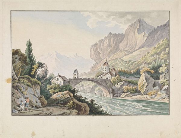 Editor: Francis Towne's watercolor, Lake of Como, presents a striking scene. The strong light filtering through the mountains creates a somewhat ethereal feel. What symbols or imagery stand out to you? Curator: The light, undeniably. Consider the sun as a symbol of enlightenment, piercing through the solid forms of the mountains. It’s a visual representation of the sublime, a concept popular during Towne's time, where nature inspires awe and a sense of the divine. What emotions does that evoke? Editor: Definitely a sense of the spiritual. It makes me think about how people have used landscape to connect with something bigger than themselves. Curator: Precisely. The very act of portraying this vista carries cultural weight. It reveals a desire to capture and understand nature, imbuing it with symbolic meaning. Editor: I hadn't thought of it that way. Thanks, I learned a lot. Curator: My pleasure. It's been insightful for me as well.