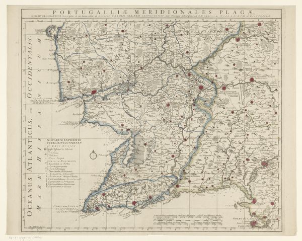 This is a map of Spain made by Anthonie de Winter around the turn of the 18th century. It's an engraving, which means that the image was incised into a metal plate, inked, and then printed onto paper. The process of engraving is painstaking. Each line you see here had to be cut into the metal by hand. The density of the lines creates shading and detail, giving the map its visual richness. Consider the skill and labor involved in creating such a detailed image through this process. It demanded both technical expertise and artistic sensibility. Maps like these were crucial tools for trade and conquest. They represented a specific worldview, emphasizing territorial control and economic interests. So, in addition to being a beautiful object, this print reflects the complex interplay of art, craft, and the political and economic forces that shaped the world we inhabit. It reminds us that even seemingly straightforward objects can carry layers of meaning and social significance.