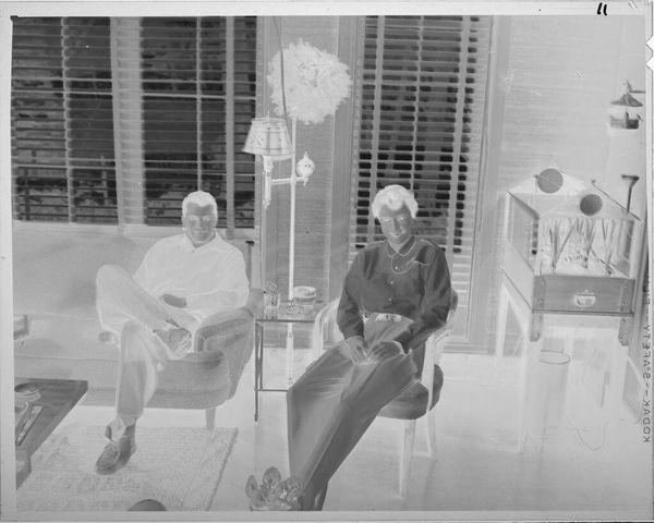 Curator: Here we have an untitled family portrait by Lainson Studios. What strikes you most about this image? Editor: The stark contrasts create an almost dreamlike quality, obscuring detail but emphasizing form. The subjects seem frozen, captured in a moment of posed perfection. Curator: This image offers a glimpse into the mid-century African American experience, subtly challenging prevailing narratives through its display of domestic comfort and affluence. Editor: The composition is carefully balanced. The subjects are arranged symmetrically around the central lamp, drawing the eye across the family group. Curator: Indeed. The family's positioning, their attire, and even the presence of the dog all contribute to a constructed image of aspiration and belonging. Editor: The photograph invites us to consider how the artist's use of light and shadow creates an atmosphere of both formality and intimacy. A window into a world of constructed meaning. Curator: Exactly, and the artwork serves as a powerful reminder of how visual culture can be used to shape and reflect societal values. Editor: I find myself pondering the semiotic weight of the image. Curator: It's an artwork that encourages us to interrogate the narratives we tell ourselves and others.